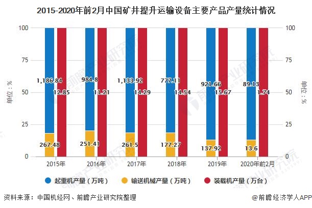 矿井提升运输设备中,起重机、输送机械(输送机和提升机)和装载机产量波动发展.其中,起重机和输送机械产量整体呈下降趋势,装载机产量整体呈上升趋势。2019年起重机、输送机械和装载机产量分别为921.66万吨、137.92万吨和15.67万台,分别同比18.60%,同比下降22.20%和同比上升7.77%。2020年1-2月,起重机、输送机械和装载机产量分别为89.13万吨、13.6万吨和1.74万台。