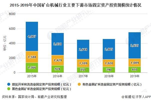 2015-2019年,矿山机械行业主要下游市场中,煤炭开采和洗选业固定资产投资规模较大,远超有色金属矿采选业和黑色金属矿采选业固定资产投资,整体而言,我国矿山机械行业主要下游市场需求回升。2019年,煤炭开采和洗选业固定资产投资规模达3635亿元,同比上升29.59%,上升幅度较大。有色金属矿采选业和黑色金属矿采选业固定资产投资规模分别为1089亿元和810亿元,分别同比上升6.76%和2.53%。
