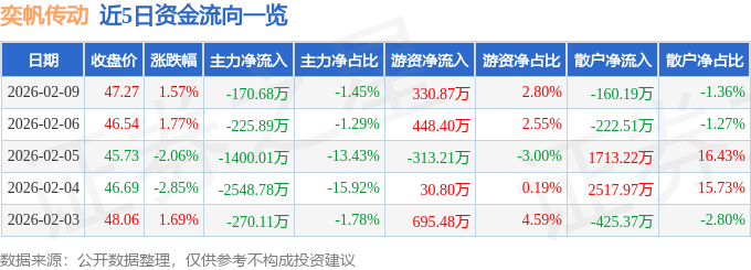 证券之星消息,截至2026年2月9日收盘,奕帆传动(301023)报收于47.27元,上涨1.57%,换手率5.99%,成交量2.51万手,成交额1.18亿元。