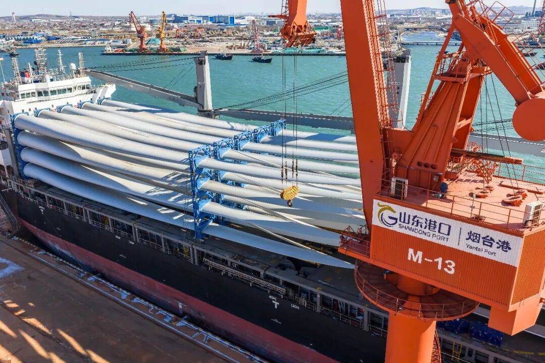 业务开展期间,烟台港与风电制造企业建立良好互动合作,结合多方需求,设计“一港直装、整机发运”模式,通过陆运方式将风筒、叶片、电机等新能源装备运至烟台港集港装船出海,提供免费堆场,降低综合物流成本。凭借烟台港件杂货“直达”航线及专业化码头,实现出口货物在港口24小时无间歇装船,进一步压缩船舶在港时间,助力“中国制造”加速出海。